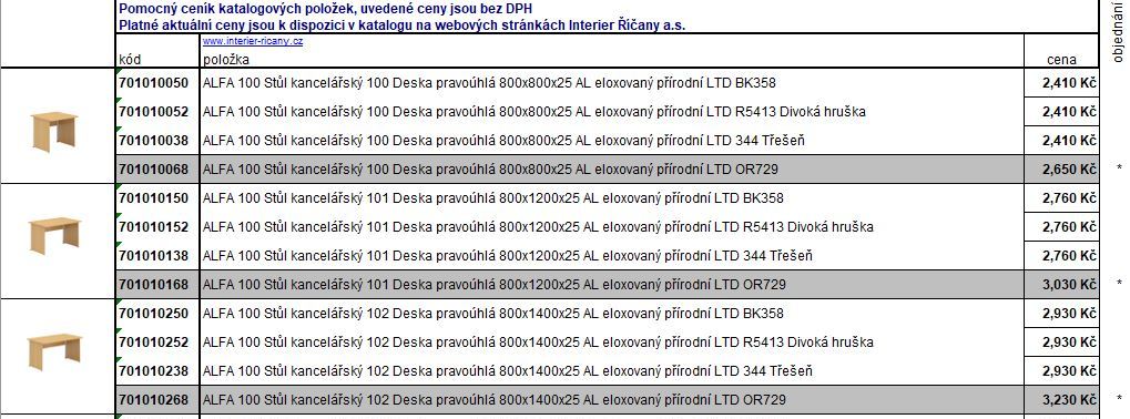 Ceník židle Excel